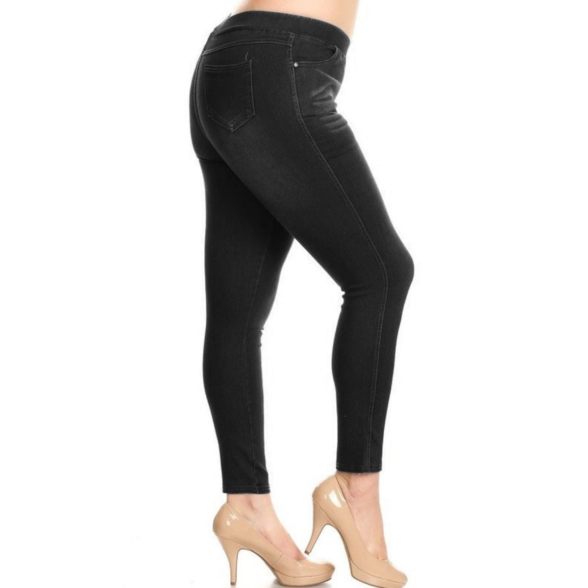 PLUS SIZE DARK ENZYME WASHED DENIM LEGGINGS WITH AN ELASTIC WAISTBAND, 4 STANDARD POCKETS AND CONTRAST STITCHING. IN WOMEN'S SIZES 10, 12, AND 14, 76% COTTON, 22% POLYESTER, 2% SPANDEX, MACHINE WASH COLD WATER, TUMBLE DRY, LOW IRON, MADE IN CHINA