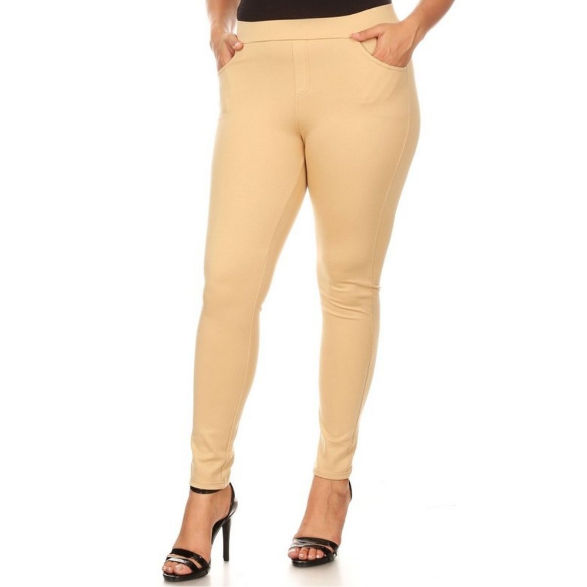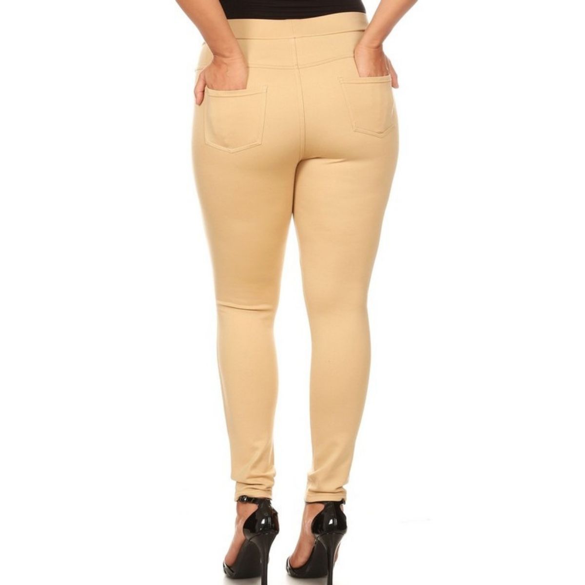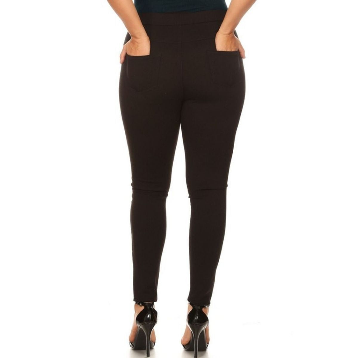 Plus size Lady's Ponte Pants available in 3 colors (Ivory, Black, Khaki) Elastic at Waist, Functional Front, & Back Pockets, Skinny Fit, Pull-Up Style, Mid Rise, 95% Polyester, 5% Spandex, Care: Machine Wash Cold, Do not Bleach, Tumble Dry Low, Iron Low, Imported