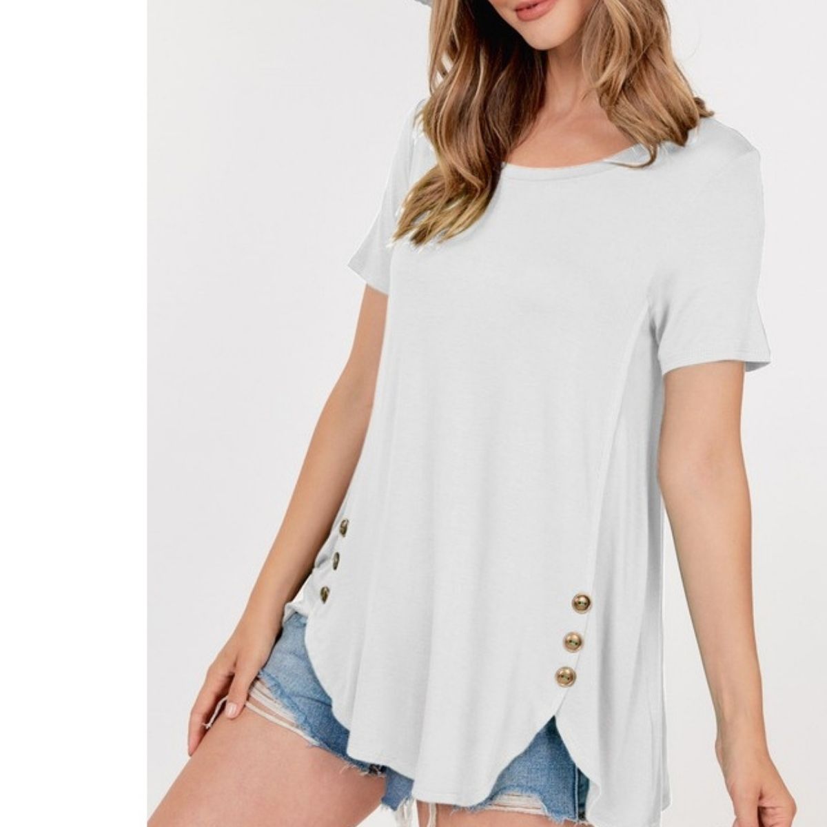 Short sleeve, round neck top, with button trim up the sides, 95% Rayon, 5% Spandex, Light Weight, Soft, Flowy, stretchy, Available in colors Off White or Champagne, and Sizes S-XL, Made in Cambodia