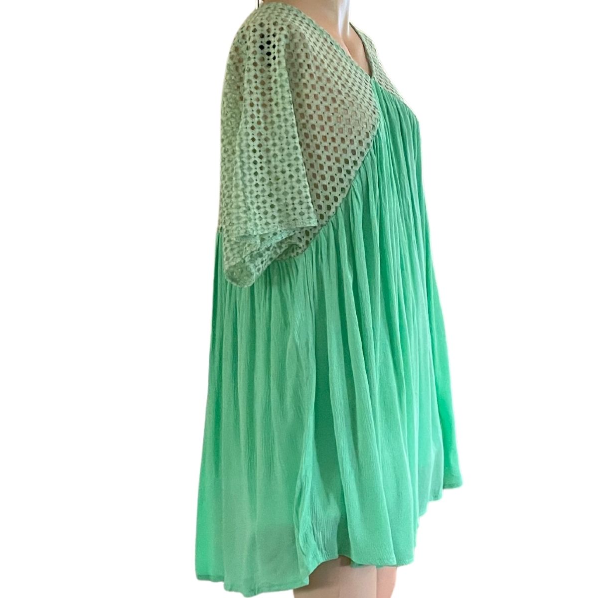 V-Neck Crotchet detailed long tunic/mini dress. 100% Rayon Hand Wash Cold, Hang Dry, Low Iron Do Not tumble dry Made In China